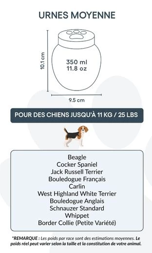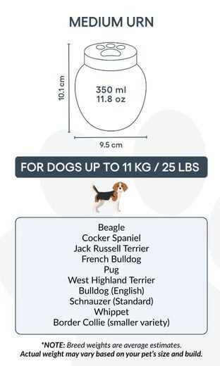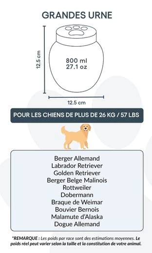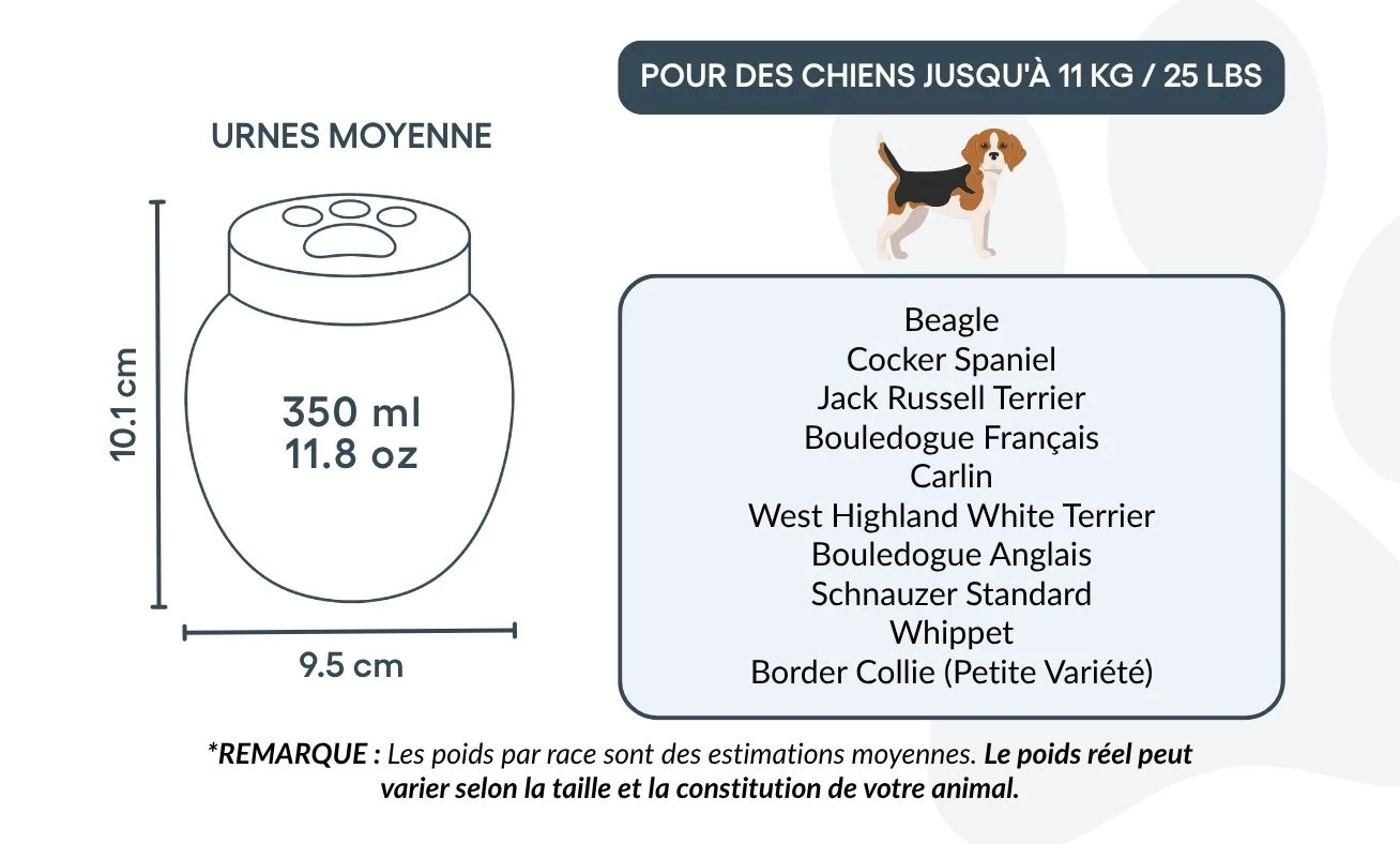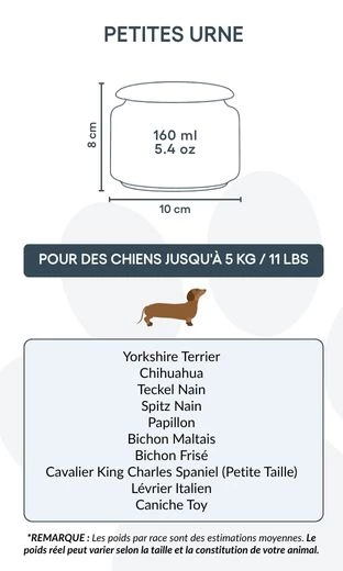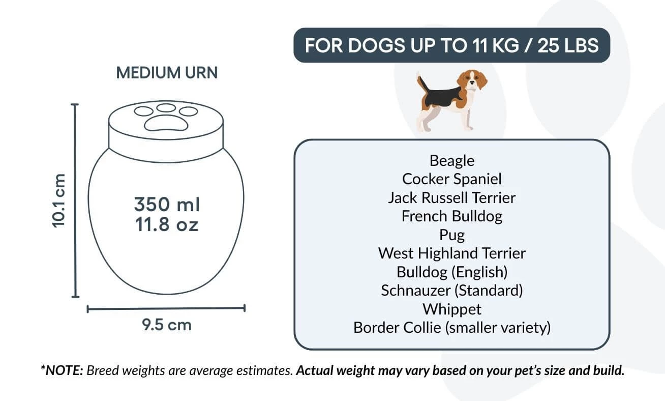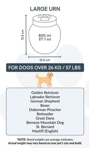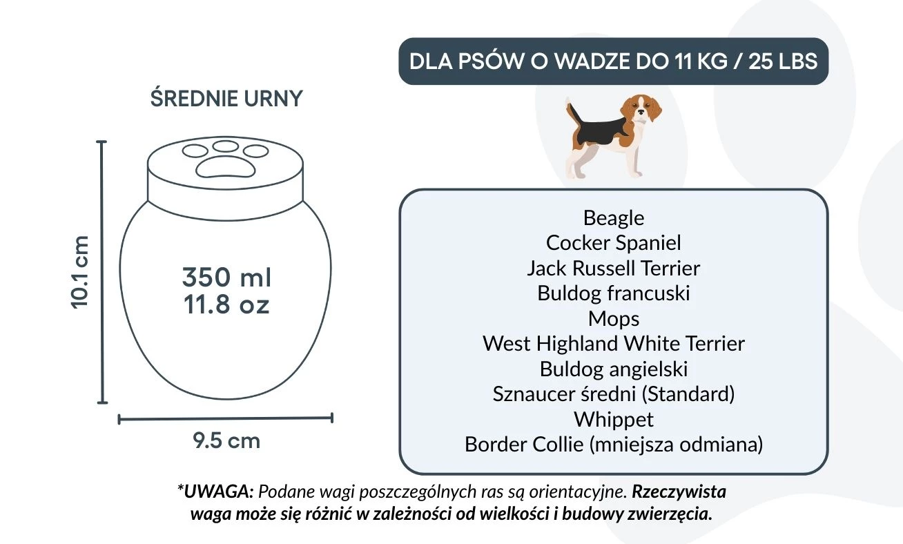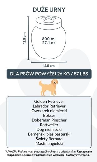 Każda urna dla psa może zostać wygrawerowana imieniem pupila oraz datami jego życia, tworząc głęboko osobistą pamiątkę. Do wyboru są trzy rozmiary, w zależności od wagi psa, co pozwala idealnie dopasować urnę zarówno do symbolicznego upamiętnienia, jak i pełnego przechowywania prochów po kremacji. Niezależnie od tego, czy zdecydujesz się na ekspozycję, czy przechowywanie w szczególnym miejscu, ta urna kremacyjna daje poczucie trwałego hołdu.