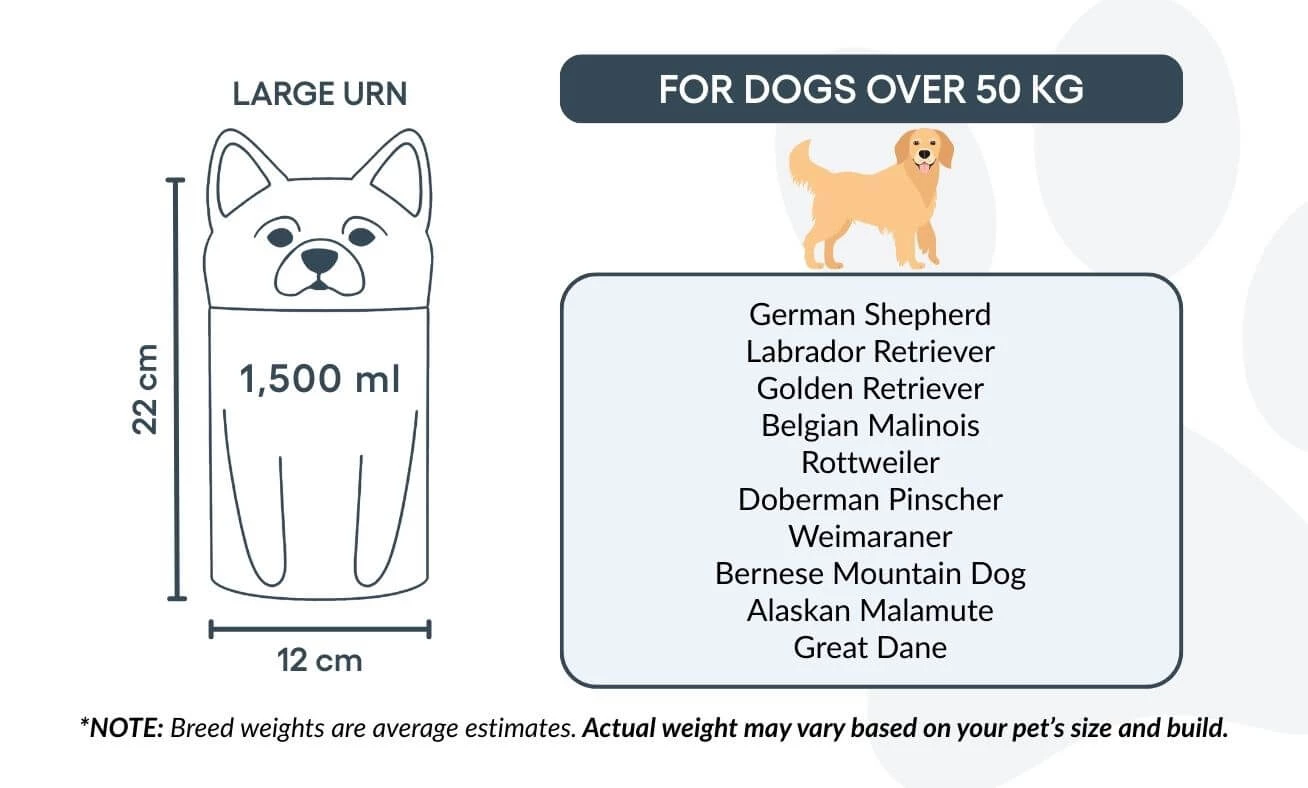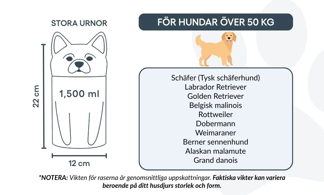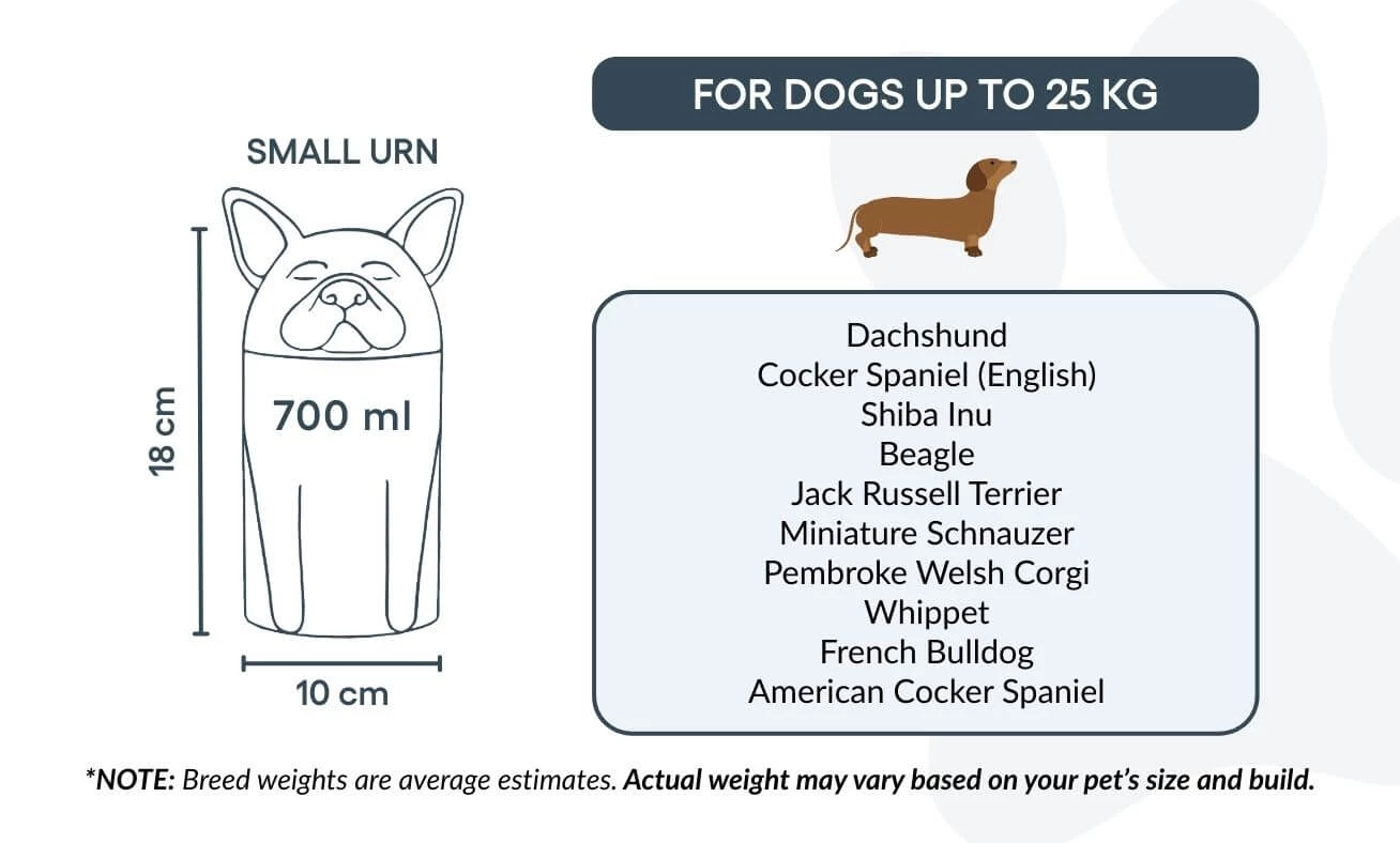 Ta urna dla psa dostępna jest w trzech rozmiarach, dopasowanych do różnych ras i wag, oraz może zostać spersonalizowana imieniem psa i ważnym tekstem. Od terierów i chihuahua po collie — ta wyjątkowa urna kremacyjna została zaprojektowana tak, aby oddać indywidualny charakter Twojego pupila.