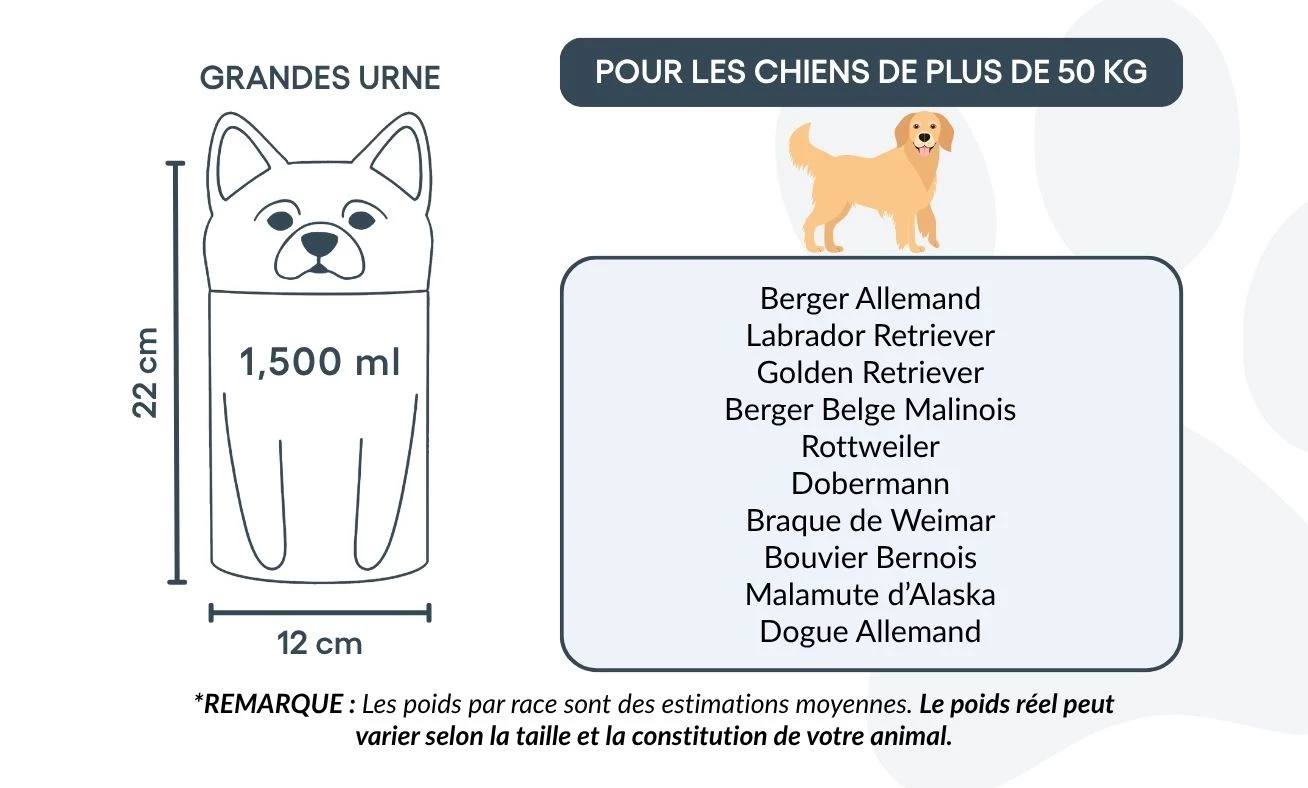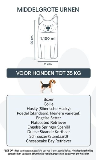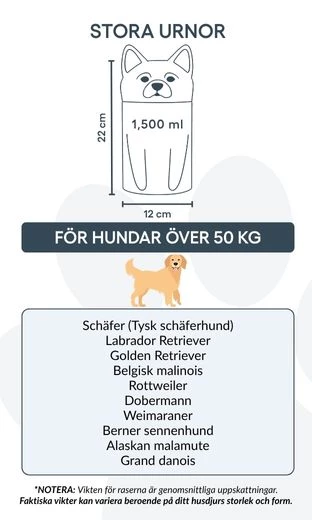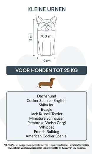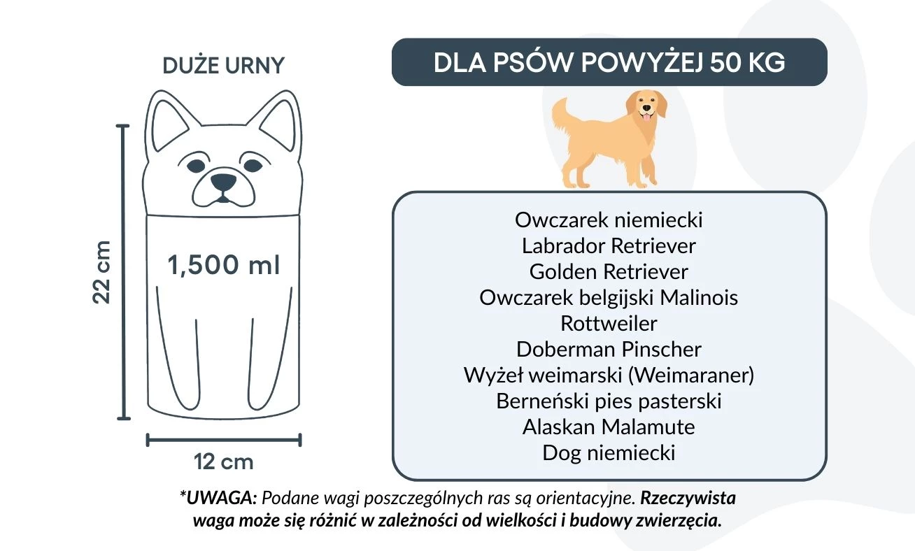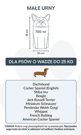 Uwaga: Podane pojemności są wartościami orientacyjnymi, opartymi na średnich wynikach kremacji zwierząt. Przy wyborze urny należy uwzględnić wagę i budowę psa.