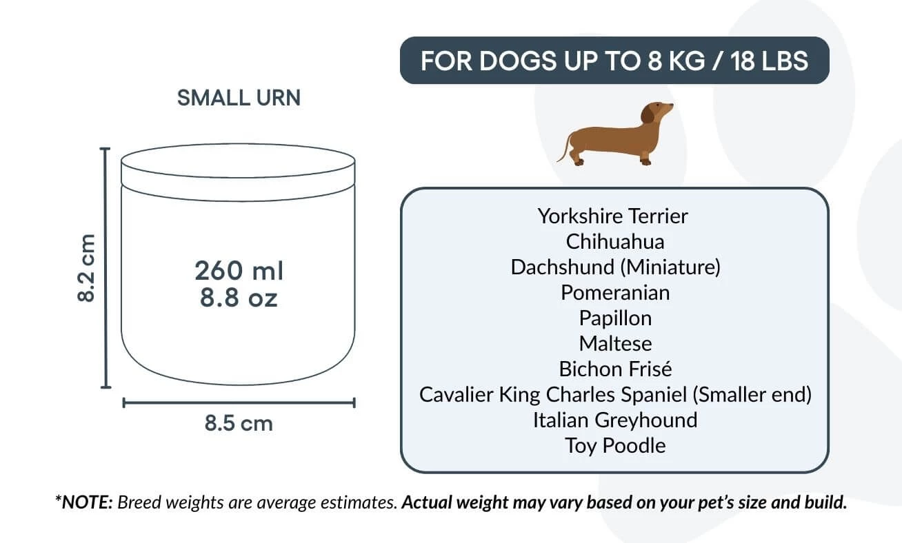 Odpowiednia zarówno dla małych, jak i średnich psów, ta ceramiczna urna dla zwierząt to coś więcej niż pojemnik — to pamiątka odzwierciedlająca miłość i więź, którą dzieliliście. Niezależnie od tego, czy ustawiona na półce, czy w specjalnym miejscu pamięci, pomaga zachować blisko wspomnienia o ukochanym pupilu.