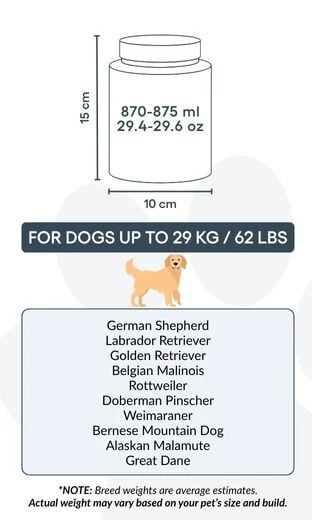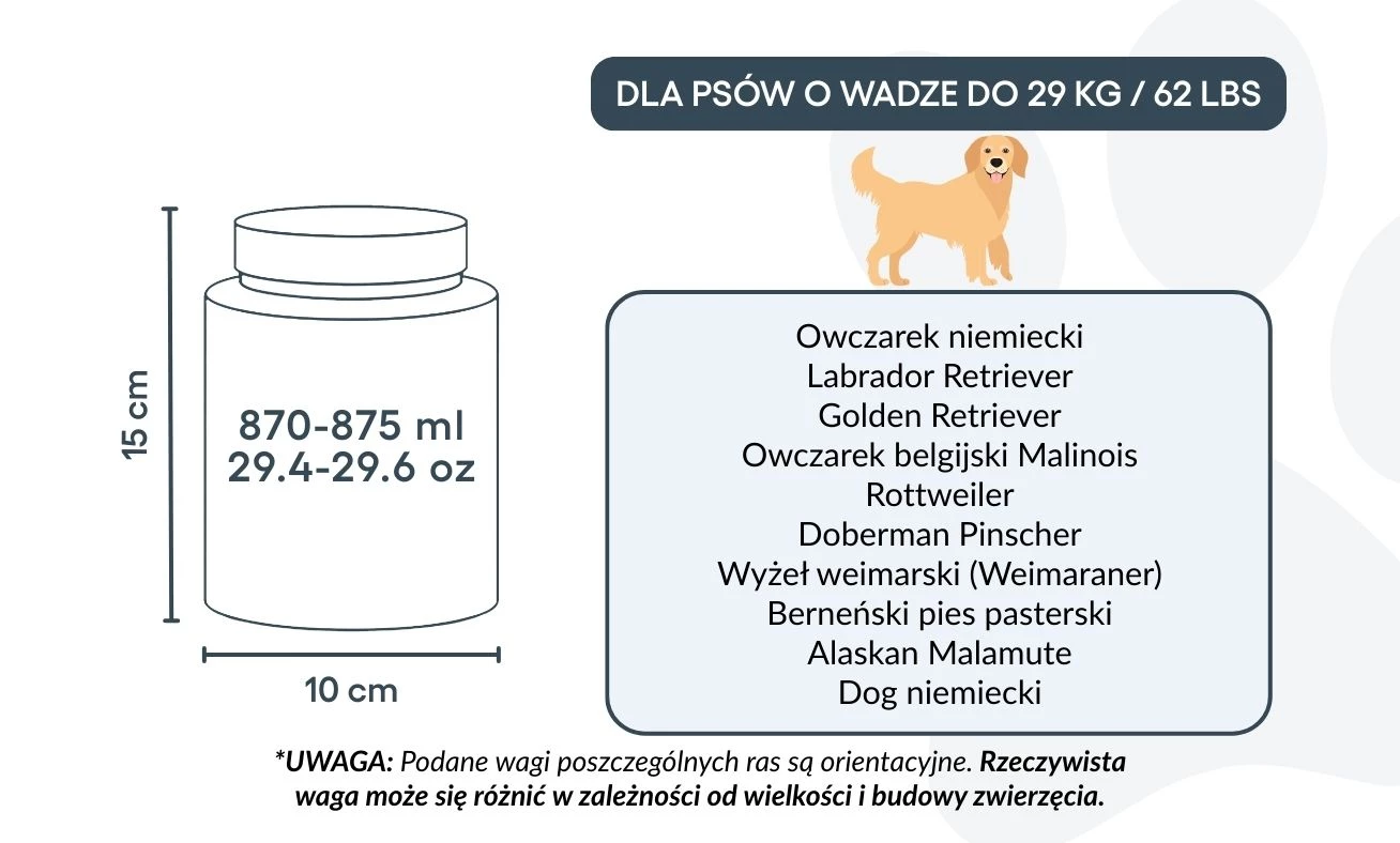 10 cm (Szer.) × 15 cm (Wys.) × 10 cm (Dł.) | 870–875 ml / 29,4–29,6 oz – odpowiednia dla psów do ok. 29 kg / 62 lbs