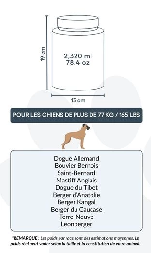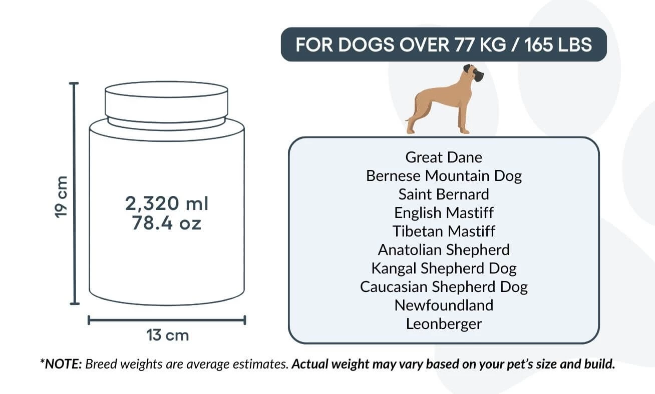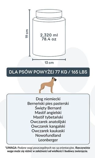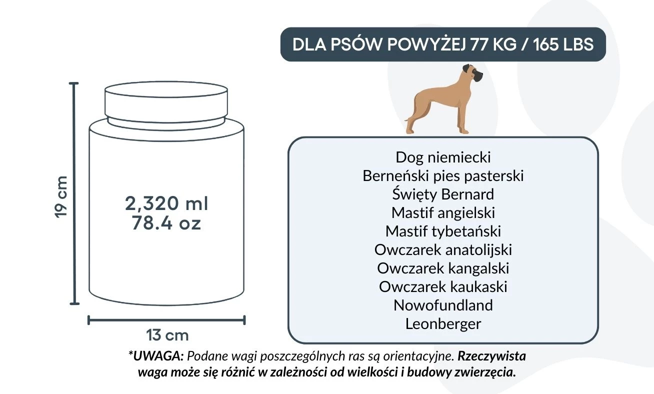 13 cm (Szer.) × 19 cm (Wys.) × 13 cm (Dł.) | ok. 2 320 ml / 78,4 oz – odpowiednia dla psów do ok. 77 kg / 165 lbs