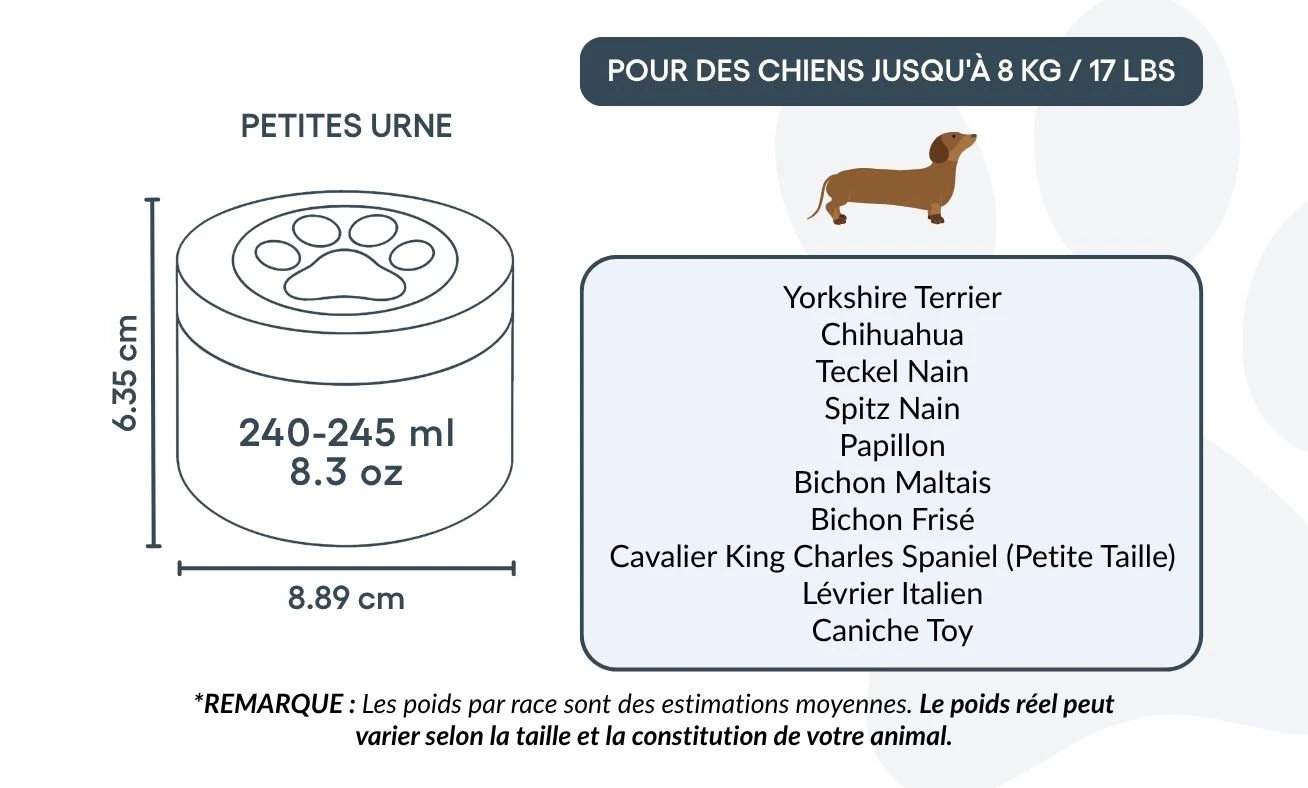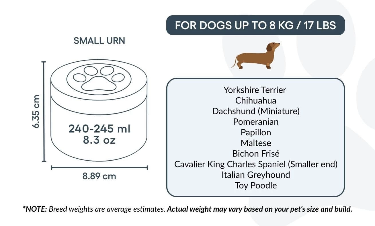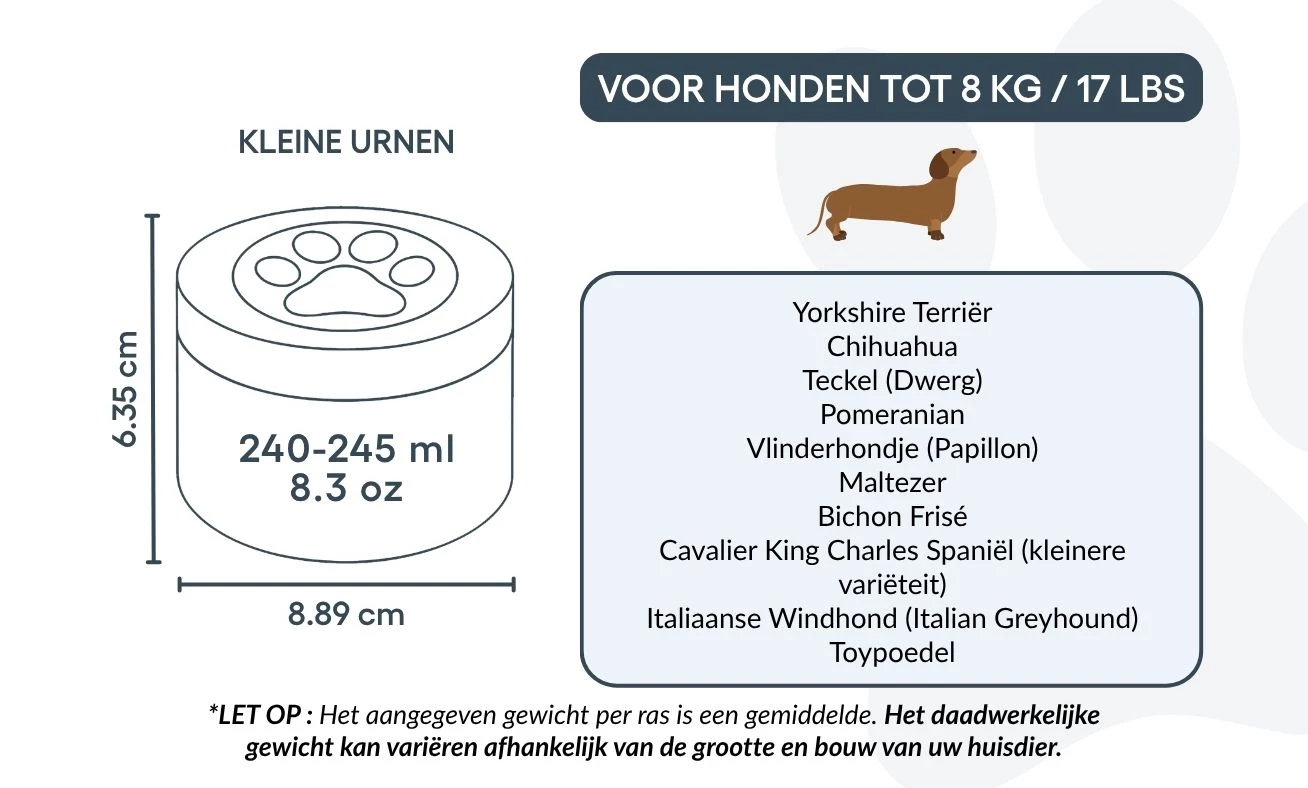 Dla osób, które chcą zachować jedynie część prochów ukochanego psa — do podziału w rodzinie, stworzenia kilku pamiątek lub połączenia z innymi formami upamiętnienia — urna ta może być również odpowiednim wyborem dla większych psów, pozwalając zachować symboliczną cząstkę blisko siebie.