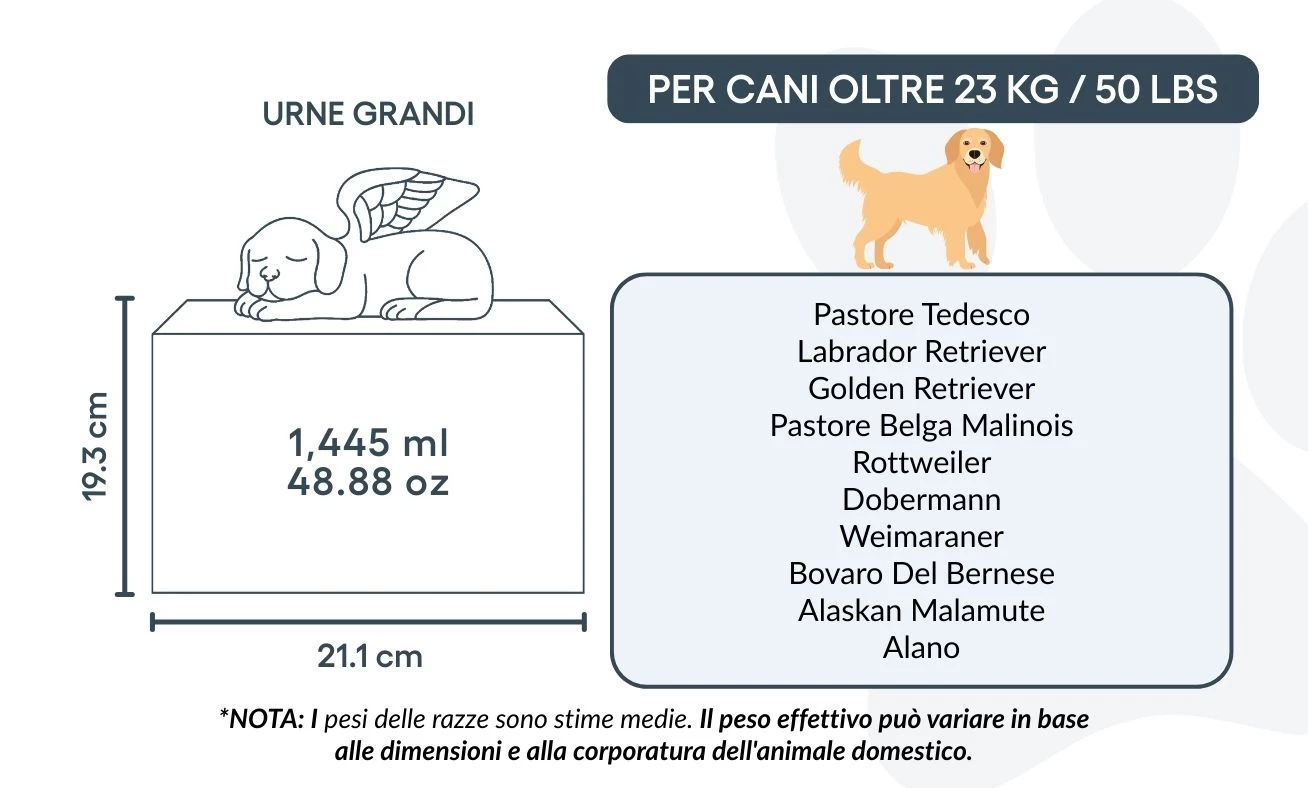 Uwaga: Podane pojemności są orientacyjne i oparte na średnich wynikach kremacji zwierząt. Przy wyborze urny należy uwzględnić wagę i budowę psa.