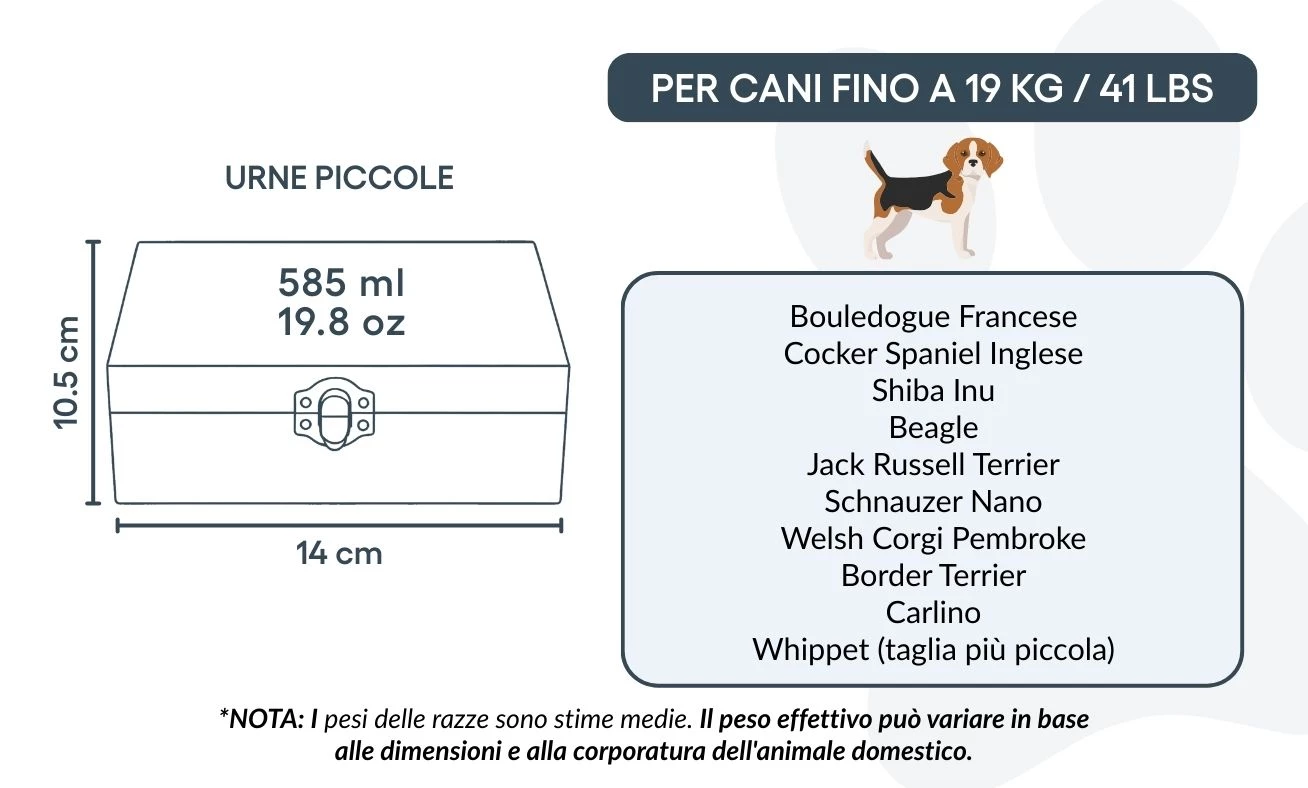 Uwaga: Podane pojemności są orientacyjne i oparte na średnich wynikach kremacji zwierząt. Przy wyborze urny należy uwzględnić wagę i budowę pupila.