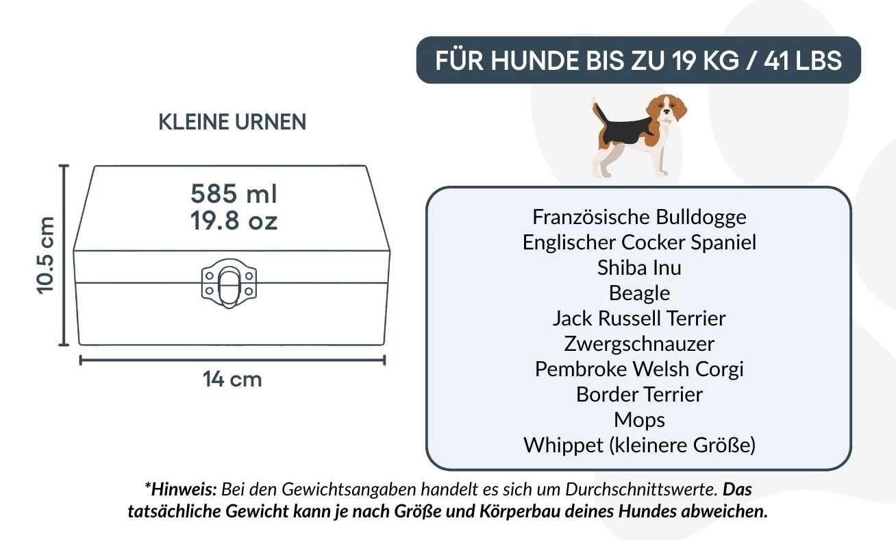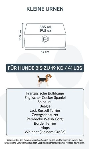 Idealna dla małych psów lub do przechowywania części prochów, ta skrzynka–urna dla psa będzie odpowiednim wyborem dla osób poszukujących godnego, spersonalizowanego upamiętnienia zwierzęcia. Może być również przemyślanym prezentem dla kogoś, kto przeżywa stratę ukochanego towarzysza.