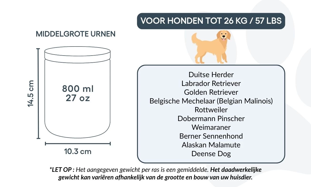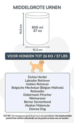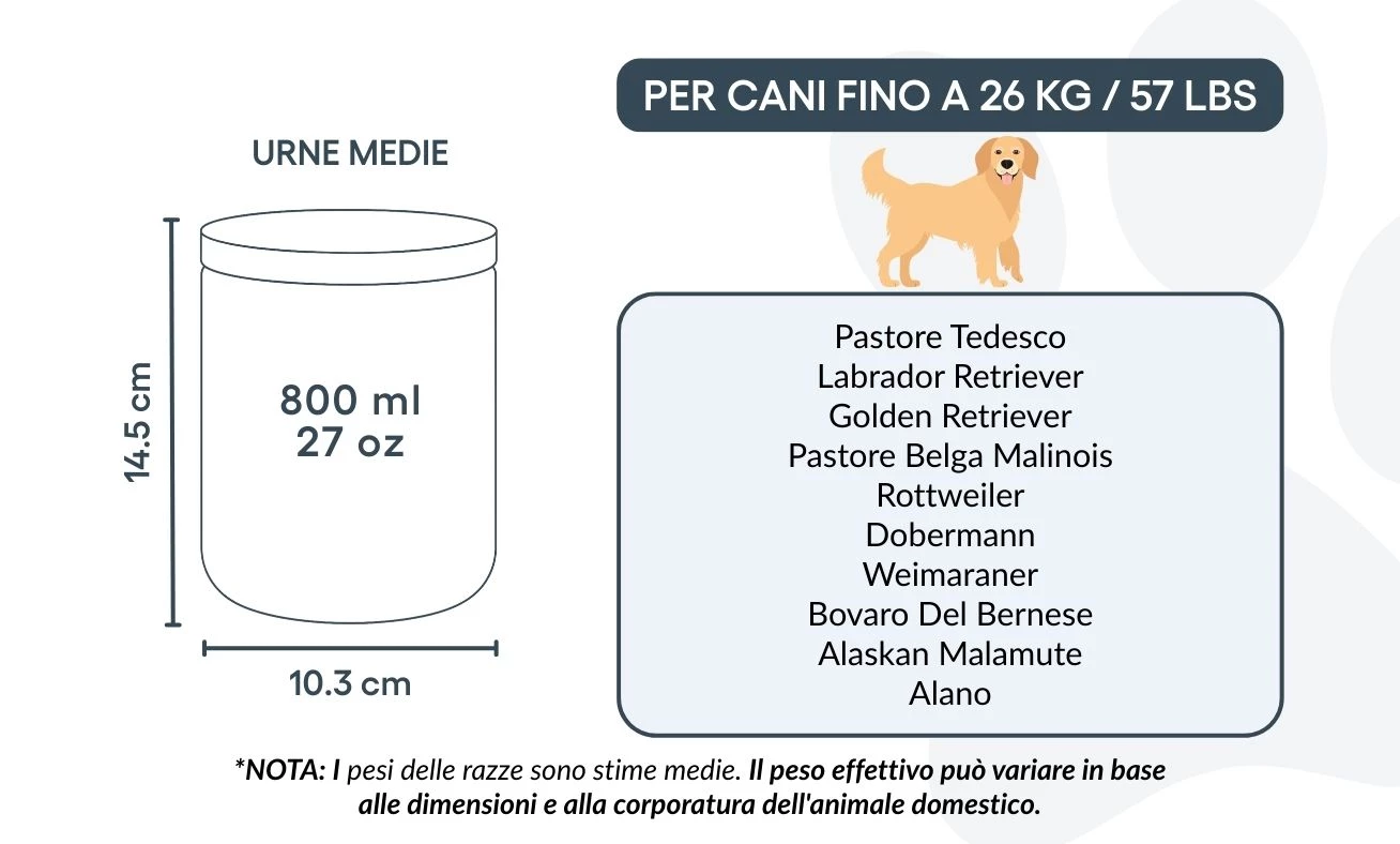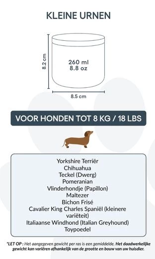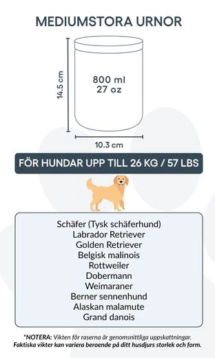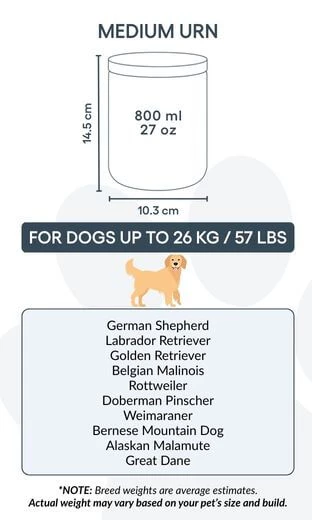 Idealna dla małych i średnich psów, ta urna kremacyjna dostępna jest w dwóch rozmiarach, odpowiednich dla zwierząt do 26 kg. Niezależnie od tego, czy ustawiona na półce, czy w cichym miejscu pamięci, stanowi prostą i wzruszającą pamiątkę wyjątkowej więzi, którą dzieliliście.