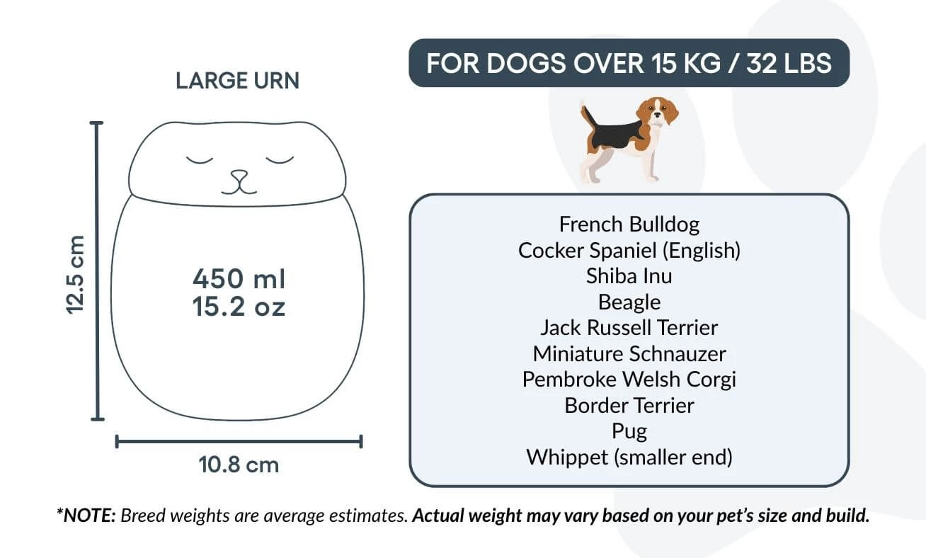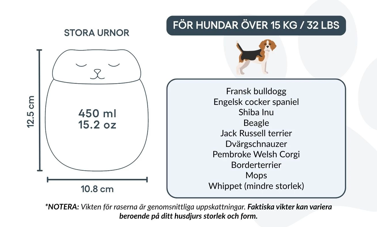 Dzięki możliwości dodania osobistego tekstu i personalizacji, urna staje się czymś więcej niż pojemnikiem — staje się częścią historii Twojego psa. Niezależnie od tego, czy ustawiona na półce, czy na stole pamięci, ta ceramiczna urna dla psa stanowi wzruszające przypomnienie wyjątkowej więzi, którą dzieliliście.