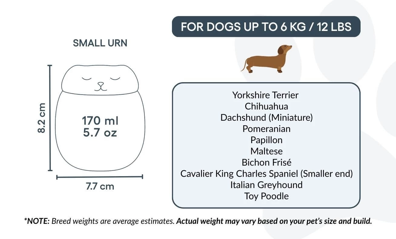 Wykonana z gładkiej, wysokiej jakości ceramiki, ta personalizowana urna dla psa posiada bezpieczne zamknięcie, które chroni prochy pupila. Kojący design oraz pokrywa ze śpiącym pupilem sprawiają, że urna doskonale nadaje się do ekspozycji wewnątrz pomieszczeń, wnosząc spokój i harmonię do miejsca pamięci.