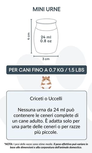 Ta miniaturowa urna idealnie sprawdzi się do przechowywania niewielkiej ilości prochów — szczególnie dla osób, które chcą podzielić pamięć o pupilu z rodziną, stworzyć kilka pamiątek lub połączyć ją z innymi formami upamiętnienia. Jej kompaktowy rozmiar sprawia, że jest dyskretna, a jednocześnie głęboko znacząca.