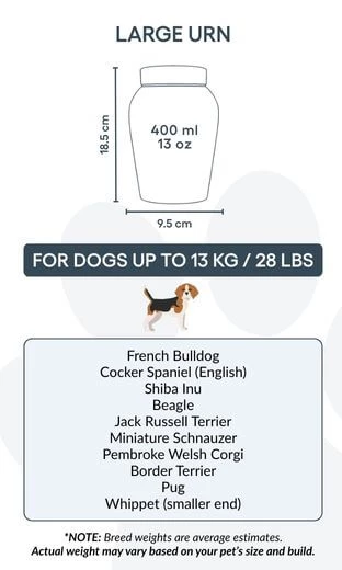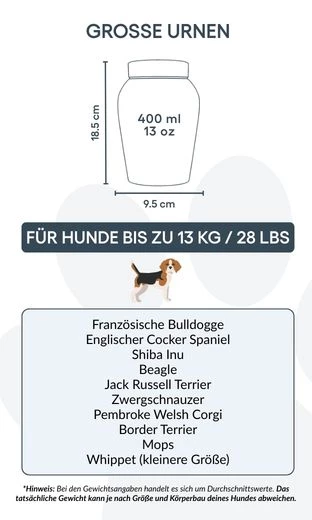 Spersonalizuj tę urnę pamiątkową danymi swojego psa, tworząc wyjątkowy hołd. Odpowiednia do kremacji i zaprojektowana do użytku wewnątrz domu, jest czymś więcej niż pojemnikiem — to symbol miłości, lojalności i wspólnych wspomnień.