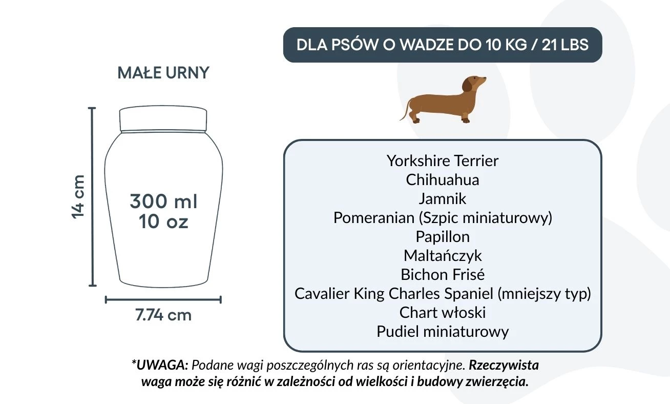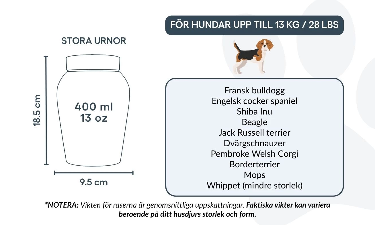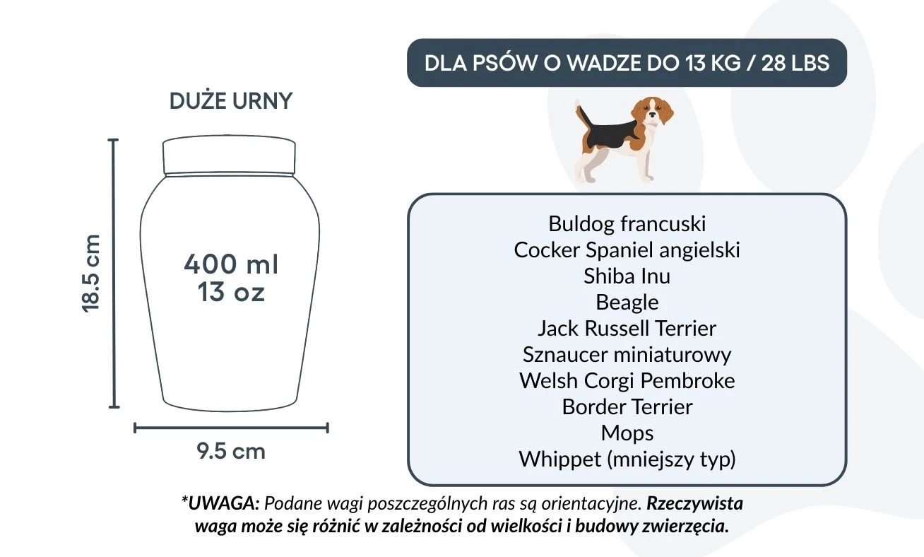 Dzięki bezpiecznemu zamknięciu oraz gładkiemu, polerowanemu wykończeniu, urna nadaje się zarówno do przechowywania prochów po kremacji, jak i do ekspozycji wewnątrz domu. Dostępna w dwóch rozmiarach, zapewnia godne miejsce spoczynku dla psów małych i średnich oraz ich prochów.