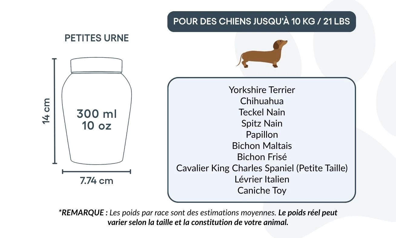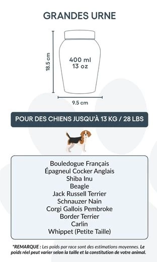 Idealna do kremacji i upamiętnienia, ta urna pamiątkowa to coś więcej niż pojemnik — to personalizowany hołd, który odzwierciedla miłość, lojalność i radość, jakie Twój pies wniósł do Twojego życia.